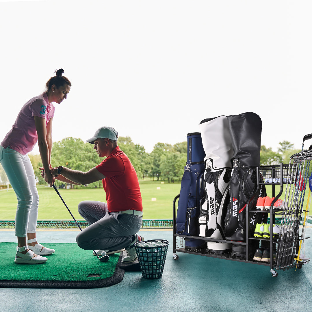 - EXTRA LARGE GOLF RACK. This golf storage holds a max of 3 bags. It is equipped with 3 layers of shoe racks and 4 removable hooks to store all your golfing equipment in one place.