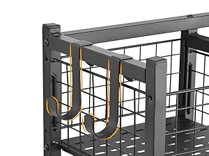 It is an attractive, functional storage rack that fits into the garage.And it holds golf bags, and a host of balls, all kind of sports gear, shoes and tools on the five racks. The rack tubing is finished on all ends ,so no jagged ends to scratch things.And the fully assembled unit is very sturdy. And this garage storage shelves is designed for organizing golf equipment and all kind of sports equipment. All-in-one sports storage racks for your garage.